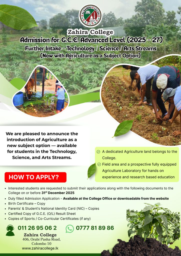 Admission for G.C.E. Advanced Level (2025 – 27) Further Intake AL APPLICATION FORM 2025-2027 Download Application Zahirians in Sri Lanka Under 17 Football Team Flood Relief Fund – 2025 Related Posts GRADE ONE ORIENTATION – 2026 Dec 10, 2025 5,216 views Flood Relief Fund – 2025 Dec 01, 2025 3,429 views G.C.E. ADVANCED LEVEL ADMISSION (2025 – 2027) Jul 17, 2025 3,384 views APPLICATION FOR ADMISSION TO GRADE 1 FOR YEAR 2026 Mar 16, 2025 7,896 views Overall Champions in Annual Islamic Day Competitions Mar 06, 2025 2,797 views