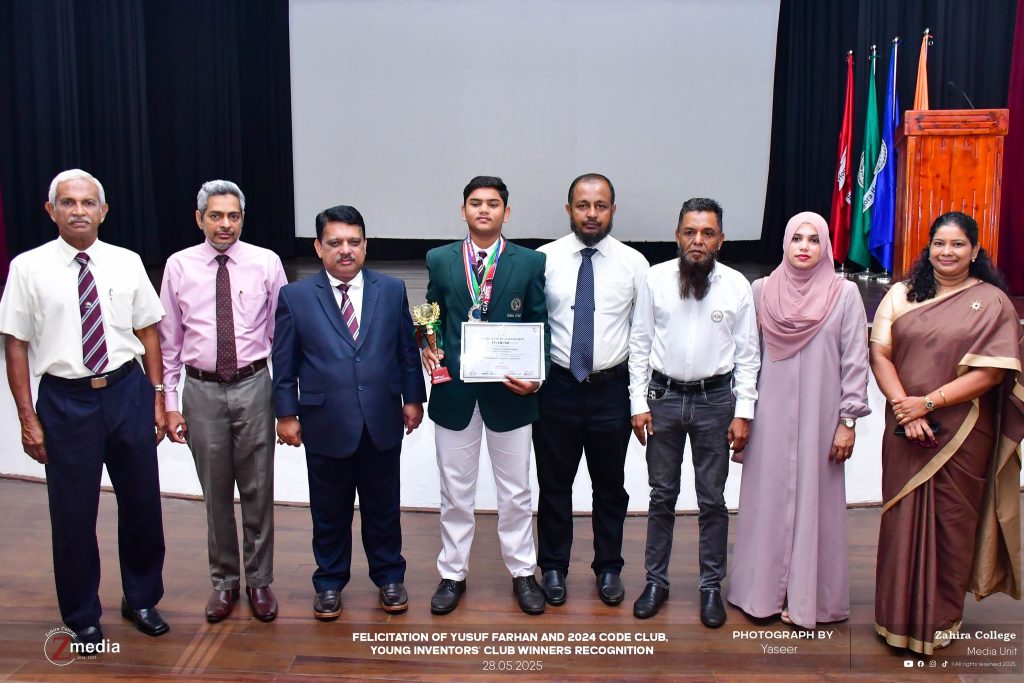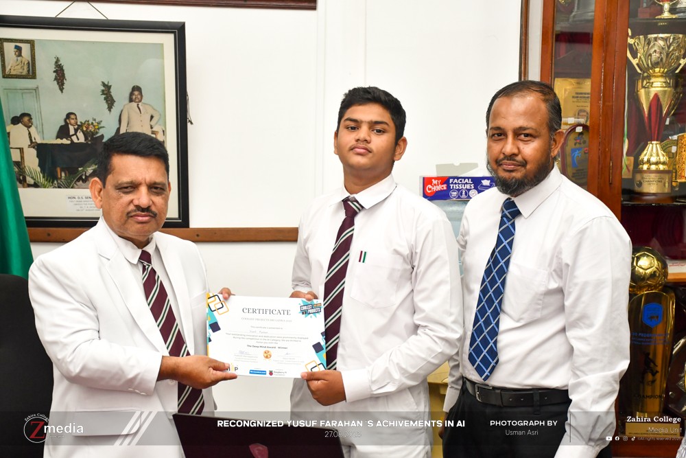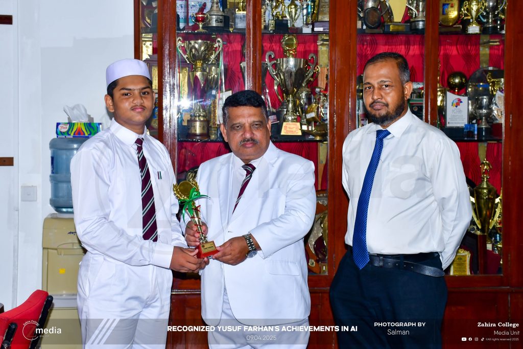 Master Yusuf Farhan, a Grade 10 student of Zahira College Colombo, has demonstrated exceptional skill, creativity, and dedication in the field of Artificial Intelligence (AI). Despite his young age, he has already achieved remarkable success at both national and internationallevels, positioning himself as a promising innovator of the future.