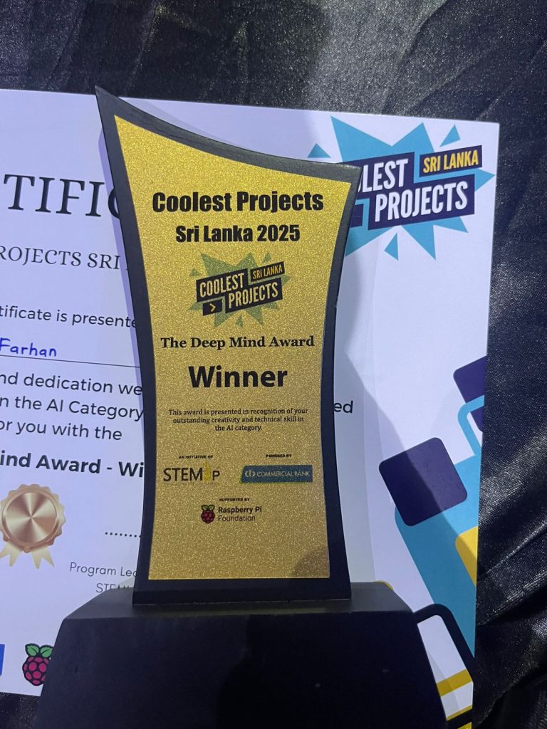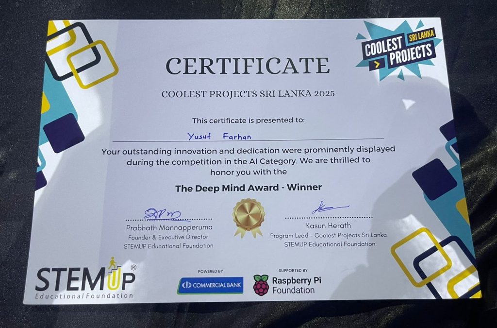 • 27th of August 2025 – Master. Yusuf Farhan Winner of the Coolers Project AI Category “Deep Mind Award” Recognized with All ICT Teachers.