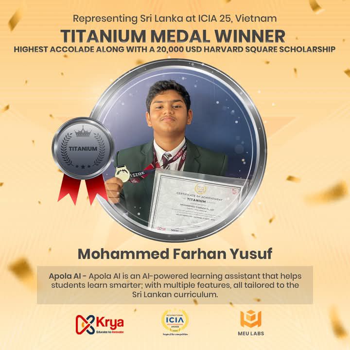 • He has also been selected to present APOLA AI at the National Industrial Expo 2025, which will be held from 18th to 21st September 2025 at BMICH, in the Innovation Arena – Industrial Exhibition.