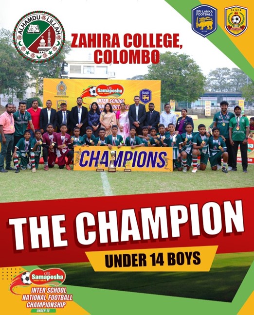 Zahira College proudly emerged victorious at the Under-14 All Island “Samaposha” Football Tournament 2025, defeating St. Patrick’s College Jaffna by 3 goals to nil comprehensively to claim the Championship trophy at the Racecourse Grounds on 11th February 2026 was conducted by the Sri Lanka Schools Football Association.